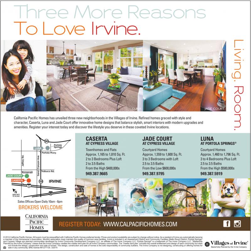 California Pacific Homes has unveiled three new neighborhoods in the Villages of Irvine. Refined homes graced with style and character,Caserta, Luna and Jade Court offer innovative home designs that balance stylish, smart interiors with modern upgrades and amenities. Register your interest today and discover the lifestyle you deserve in these coveted Irvine locations.
