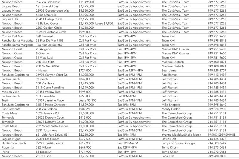 Newport Beach 926 Via Lido Nord $11,495,000 Sat/Sun By Appointment The Coté/Vasu Team 949.677.5268 Laguna Beach 121 Emerald Bay $7,495,000 Sat/Sun By Appointment The Coté/Vasu Team 949.677.5268 Laguna Niguel 22902 Oceanbreeze Way $5,580,000 Sat/Sun By Appointment The Coté/Vasu Team 949.677.5268 Newport Beach 4 Rue Deauville $2,995,000 Sat/Sun By Appointment The Coté/Vasu Team 949.677.5268 Laguna Hills 25411 Gallup Circle $2,195,000 Sat/Sun By Appointment The Coté/Vasu Team 949.677.5268 Newport Beach 43 Balboa Coves $2,495,000 Lease $7,900 Sat/Sun By Appointment The Coté/Vasu Team 949.677.5268 Newport Beach 2207 Golden Circle $1,288,000 Sat/Sun By Appointment The Coté/Vasu Team 949.677.5268 Newport Beach 1025 N. Antonio Circle $995,000 Sat/Sun By Appointment The Coté/Vasu Team 949.677.5268 Corona Del Mar 320 Seaward Call For Price Sun 1PM-4PM Team Kiwi 949.751.9600 Rancho Santa Margarita 52 Flor De Mar #108 Call For Price Sat/Sun By Appointment Team Kiwi 949.698.8048 Rancho Santa Margarita 126 Flor De Sol #69 Call For Price Sat/Sun By Appointment Team Kiwi 949.698.8048 Newport Coast 25 Avignon Call For Price Sun 1PM-4PM Marcus KIWI Gualter 949.751.9600 Newport Coast 8 Giverny Call For Price Sun 1PM-4PM Marcus KIWI Gualter 949.751.9600 Newport Coast 31 Vista Luci Call For Price Sun 1PM-4PM Team Kiwi 949.751.9600 Newport Beach 230 Lille #206 Call For Price Sun 1PM-4PM Marlene Dietrich 949.400.1021 Newport Beach 200 McNeil #104 Call For Price Sun 1PM-4PM Marlene Dietrich 949.400.1021 Newport Beach 4 Kialoa $724,000 Sat/Sun 12PM-4PM Sean Jarne 949.929.8707 San Juan Capistrano 26901 Canyon Crest Dr. $1,095,000 Sat/Sun 1PM-4PM Raul Ramos 949.413.1492 Ladera Ranch 9 Chianti $849,000 Sat/Sun 1PM-4PM Jeff Pittman 714.785.4434 Newport Beach 108 Via Havre $3,445,000 Sat/Sun 1PM-4PM Jeff Pittman 714.785.4434 Newport Beach 3119 Corte Portofino $1,349,000 Sat/Sun 1PM-4PM Jeff Pittman 714.785.4434 Mission Viejo 22451 Willow Tree $995,000 Sat/Sun 1PM-4PM Jeff Pittman 714.785.4434 Ladera Ranch 10 Flowerdale $650,000 Sat 1PM-4PM Jeff Pittman 714.785.4434 Tustin 15557 Jasmine Place Lease $3,300 Sat/Sun 1PM-4PM Jeff Pittman 714.785.4434 San Juan Capistrano 31512 Paseo Christina $1,899,000 Sat 1PM-5PM Mike Shepard 949.395.6640 San Clemente 208 Via Sedona $907,250 Sat/Sun 1PM-4PM Monty Gaden 949.324.7900 Costa Mesa 1828 Jamaica Rd $1,500,000 Sat/Sun 1PM-4PM The Carmichael Group 714.751.2181 Temecula 38025 Dorothy Court $415,000 Sat/Sun By Appointment The Carmichael Group 714.751.2181 Temecula 38025 Dorothy Court $1,200,000 Sat/Sun By Appointment The Carmichael Group 714.751.2181 Costa Mesa 232 Monte Vista Avenue $1,000,000 Sat/Sun By Appointment The Carmichael Group 714.751.2181 Newport Beach 2331 Tustin Ave $2,495,000 Sat/Sun 1PM-6PM The Carmichael Group 714.751.2181 Newport Beach 621 Lido Park Drive, #E-1 $2,250,000 Sat 1PM-4PM Yvonne Matilsky/Sheila Marsh 949.702.3403/949.300.0818 Laguna Niguel 29391 Las Cruces $679,500 Sat/Sun 1PM-4PM David Holt 714.425.1372 Huntington Beach 9922 Constitution Dr. $619,900 Sun 12PM-4PM Larry and Susan Goudgw 714.803.6649 Placentia 532 Milano $649,900 Sat 12PM-4PM Terrie Khosh 714.273.0461 Irvine 53 Essex Ln. $774,900 Sun 1PM-4PM Terrie Khosh 714.273.0461 Newport Beach 2319 Tustin $1,725,000 Sat/Sun 1PM-4PM Lana Fish 949.280.3000