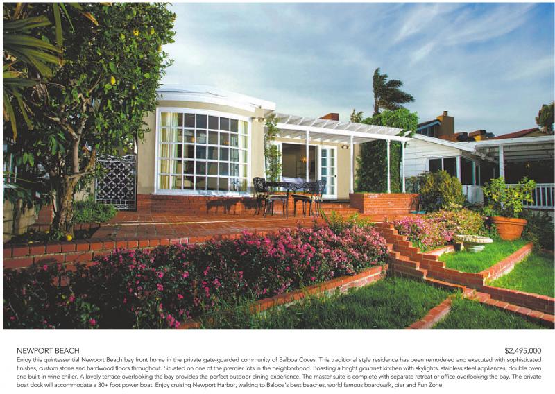 NEWPORT BEACH $2,495,000 Enjoy this quintessential Newport Beach bay front home in the private gate-guarded community of Balboa Coves. This traditional style residence has been remodeled and executed with sophisticated finishes, custom stone and hardwood floors throughout. Situated on one of the premier lots in the neighborhood. Boasting abright gourmet kitchen with skylights, stainless steel appliances, double oven and built-in wine chiller. Alovely terrace overlooking the bay provides the perfect outdoor dining experience. The master suite is complete with separate retreat or office overlooking the bay. The private boat dock will accommodate a30+ foot power boat. Enjoy cruising Newport Harbor, walking to Balboa’s best beaches, world famous boardwalk, pier and Fun Zone.