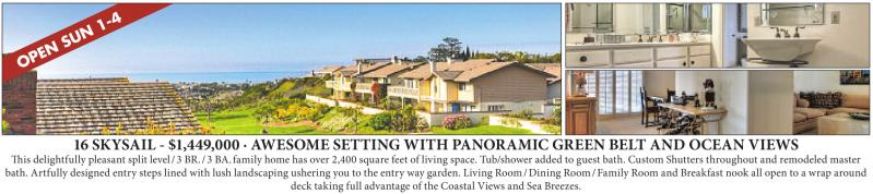 16 SKYSAIL - $1,449,000 · AWESOME SETTING WITH PANORAMIC GREEN BELT AND OCEAN VIEWS This delightfully pleasant split level/3 BR./3 BA.family home has over 2,400 square feet of living space. Tub/shower added to guest bath. Custom Shutters throughout and remodeled master bath. Artfully designed entry steps lined with lush landscaping ushering you to the entry way garden. Living Room/Dining Room/Family Room and Breakfast nook all open to a wrap around deck taking full advantage of the Coastal Views and Sea Breezes.