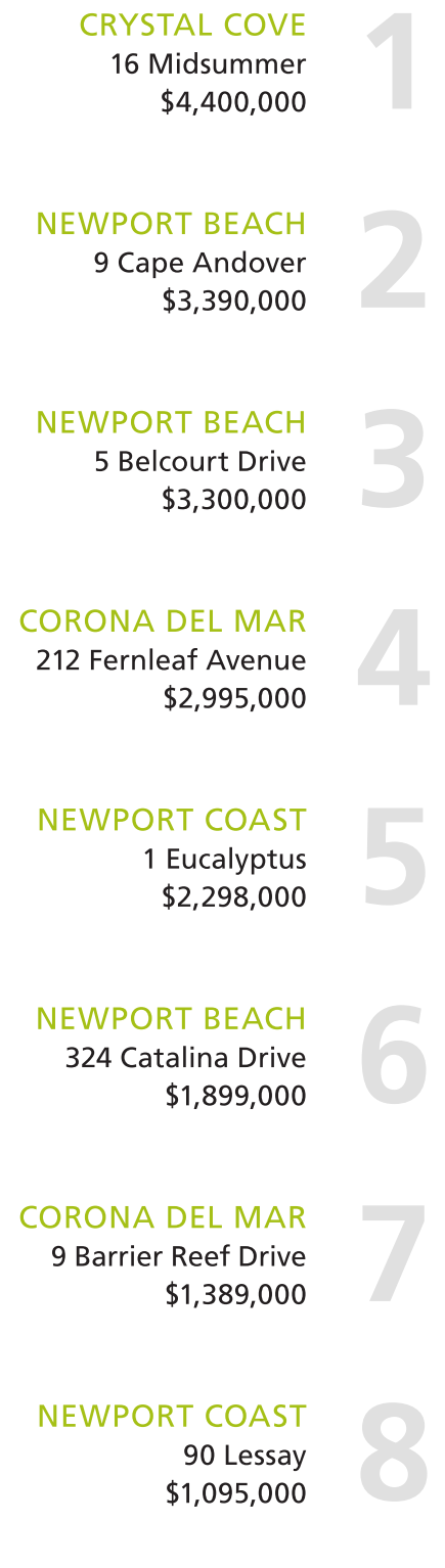 CRYSTAL COVE 16 Midsummer $4,400,000 NEWPORT BEACH 9 Cape Andover $3,390,000 1 2 NEWPORT BEACH 5 Belcourt Drive $3,300,000 3 CORONA DEL MAR 212 Fernleaf Avenue $2,995,000 4 NEWPORT COAST 1 Eucalyptus $2,298,000 5 NEWPORT BEACH 324 Catalina Drive $1,899,000 6 CORONA DEL MAR 9 Barrier Reef Drive $1,389,000 7 NEWPORT COAST 90 Lessay $1,095,000 8