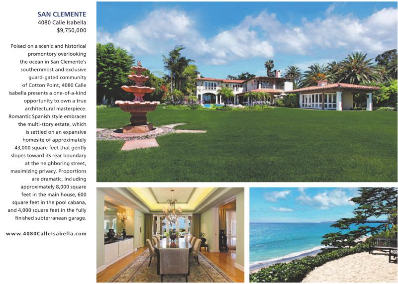 SAN CLEMENTE 4080 Calle Isabella $9,750,000 Poised on a scenic and historical promontory overlooking the ocean in San Clemente’s southernmost and exclusive guard-gated community of Cotton Point, 4080 Calle Isabella presents a one-of-a-kind opportunity to own a true architectural masterpiece. Romantic Spanish style embraces the multi-story estate, which is settled on an expansive homesite of approximately 43,000 square feet that gently slopes toward its rear boundary at the neighboring street, maximizing privacy. Proportions are dramatic, including approximately 8,000 square feet in the main house, 600 square feet in the pool cabana, and 4,000 square feet in the fully finished subterranean garage. www.4080CalleIsabella.com