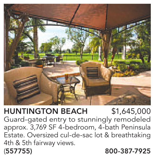 HUNTINGTON BEACH $1,645,000 Guard-gated entry to stunningly remodeled approx. 3,769 SF 4-bedroom, 4-bath Peninsula Estate. Oversized cul-de-sac lot & breathtaking 4th&5th fairwayviews. (557755) 800-387-7925
