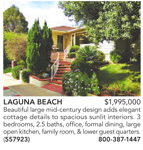 LAGUNA BEACH $1,995,000 Beautiful largemid-century design adds elegant cottage details to spacious sunlit interiors. 3 bedrooms, 2.5baths,office,formaldining, large open kitchen, familyroom,&lowerguest quarters. (557923) 800-387-1447
