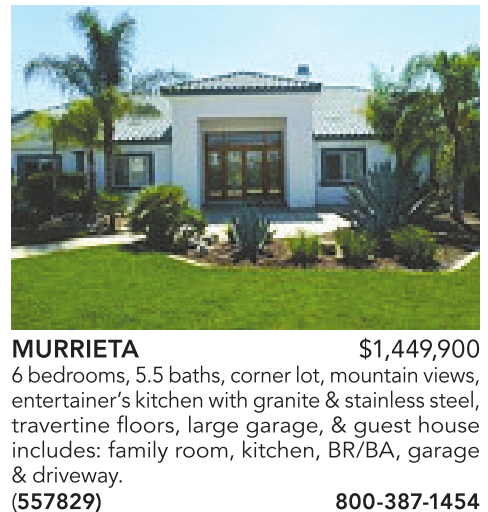 MURRIETA $1,449,900 6bedrooms, 5.5baths,cornerlot, mountain views, entertainer’skitchen with granite&stainless steel, travertine floors, large garage, & guest house includes: family room, kitchen, BR/BA, garage &driveway. (557829) 800-387-1454