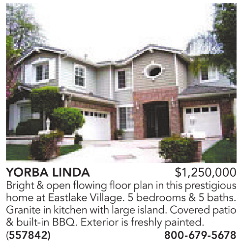 YORBA LINDA $1,250,000 Bright &openflowingfloorplaninthisprestigious home at Eastlake Village. 5bedrooms&5baths. Graniteinkitchen with largeisland.Coveredpatio &built-inBBQ.Exteriorisfreshly painted. (557842) 800-679-5678