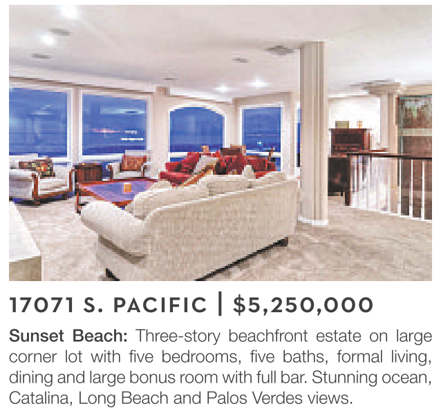 Sunset Beach: Three-story beachfront estate on large corner lot with five bedrooms, five baths, formal living, dining and large bonus room with full bar. Stunning ocean, Catalina, Long Beach and Palos Verdes views.
