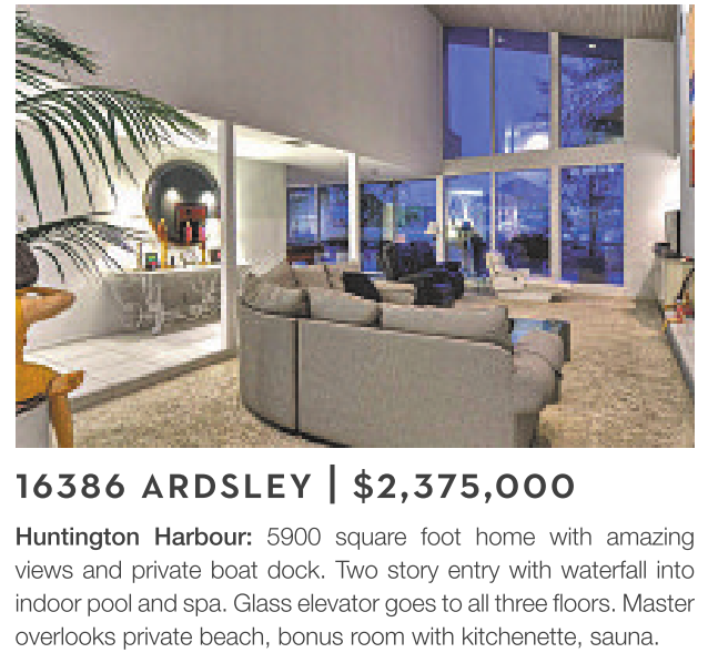 16386 ARDSLEY | $2,375,000 Huntington Harbour: 5900 square foot home with amazing views and private boat dock. Two story entry with waterfall into indoor pool and spa. Glass elevatorgoes to all three floors. Master overlooks private beach, bonus room with kitchenette, sauna.
