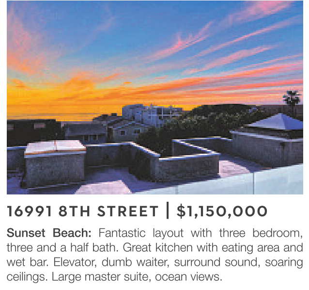 Sunset Beach: Fantastic layout with three bedroom, three and a half bath. Great kitchen with eating area and wet bar. Elevator, dumb waiter, surround sound, soaring ceilings. Large master suite, ocean views.