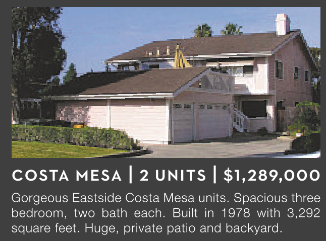 Gorgeous Eastside Costa Mesa units. Spacious three bedroom, two bath each. Built in 1978 with 3,292 square feet. Huge, private patio and backyard.