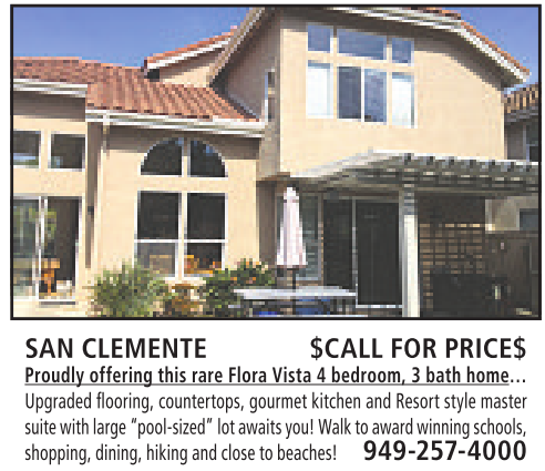 SAN CLEMENTE $CALL FOR PRICE$ Proudly offering this rare Flora Vista 4bedroom, 3bath home… Upgraded flooring, countertops, gourmet kitchen and Resort style master suite with large “pool-sized” lotawaits you! Walk to award winningschools, shopping, dining, hikingand close to beaches! 949-257-4000