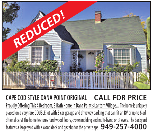 CAPE COD STYLE DANA POINT ORIGINAL CALL FOR PRICE ProudlyOffering This 4Bedroom,3BathHome In Dana Point’s LanternVillage… Thehome is uniquely placed onavery rare DOUBLE lot with 3car garage and driveway parking that can fitanRVorupto6additional cars!The home featureshardwood floors, crown molding andmulti-living on 3levels. Thebackyard featuresalarge yard with awood deck andgazebo for theprivatespa. 949-257-4000