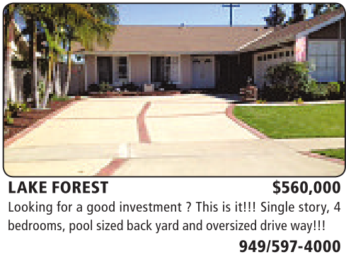 LAKE FOREST $560,000 Looking for agood investment ?This is it!!! Single story, 4 bedrooms,poolsizedback yard andoversizeddriveway!!!