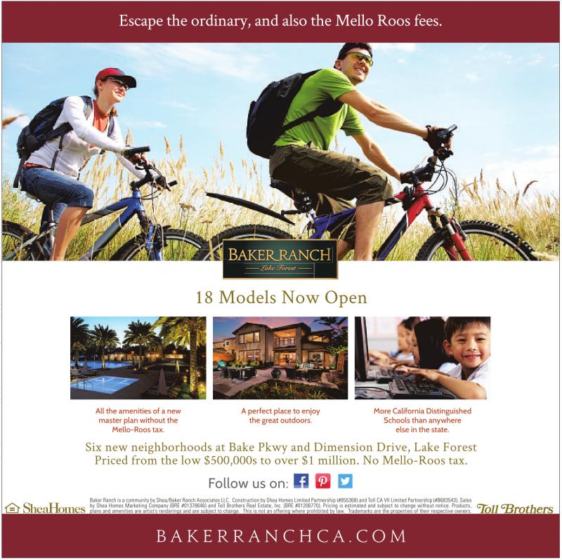Escape the ordinary, and also the Mello Roos fees. 18 Models Now Open All the amenities of a new master plan without the Mello-Roos tax. A perfect place to enjoy the great outdoors. More California Distinguished Schools than anywhere else in the state. Six new neighborhoods at Bake Pkwy and Dimension Drive, Lake Forest Priced from the low $500,000s to over $1 million. No Mello-Roos tax. Follow us on: Baker Ranch is acommunity by Shea/Baker Ranch Associates LLC. Construction by Shea Homes Limited Partnership (#855368) and Toll CA VII Limited Partnership (#B683543), Sales by Shea Homes Marketing Company (BRE #01378646) and Toll Brothers Real Estate, Inc. (BRE #01206770). Pricing is estimated and subject to change without notice. Products, plans and amenities are artist’s renderings and are subject to change. This is not an offering where prohibited by law. Trademarks are the properties of their respective owners. 6 n e w n e i g h b o r h o o d s D E D I C A T E D B A K E R R A N C H c a . C O M T O L I F E ’ S A D V E N T U R E S