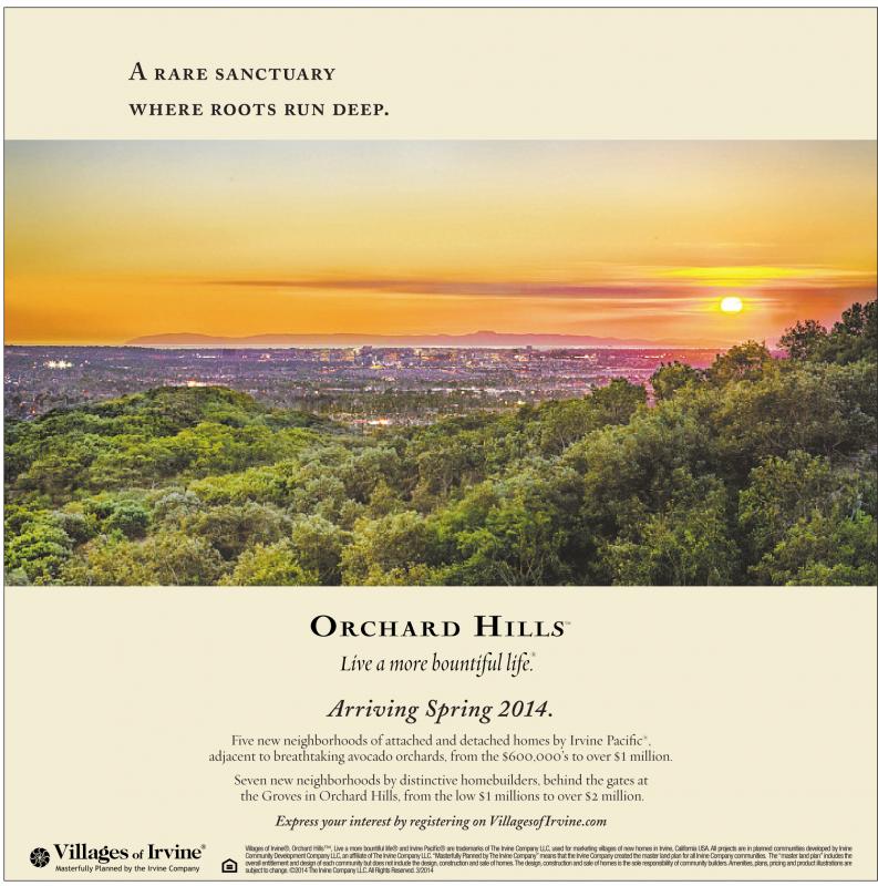 A rare sanctuary where roots run deep. Arriving Spring 2014. Five new neighborhoods of attached and detached homes by Irvine Pacific ® , adjacent to breathtaking avocado orchards, from the $600,000’s to over $1 million. Seven new neighborhoods by distinctive homebuilders, behind the gates at the Groves in Orchard Hills, from the low $1 millions to over $2 million. Express your interest by registering on VillagesofIrvine.com Villages of Irvine®, Orchard Hills™, Live amore bountiful life® and Irvine Pacific® are trademarks of The Irvine CompanyLLC, used for marketing villages of new homes in Irvine, California USA. All projects are in planned communities developed by Irvine Community Development CompanyLLC,an affiliate ofThe Irvine CompanyLLC.“Masterfully Planned byThe Irvine Company”means thatthe Irvine Companycreated the master land plan for all Irvine Companycommunities. The“master land plan”includes the overall entitlement and design of each community but does not include the design, construction and sale of homes.The design, construction and sale of homes is the sole responsibility of community builders.Amenities, plans, pricing and product illustrations are subject to change. ©2014 The Irvine CompanyLLC.All Rights Reserved. 3/2014
