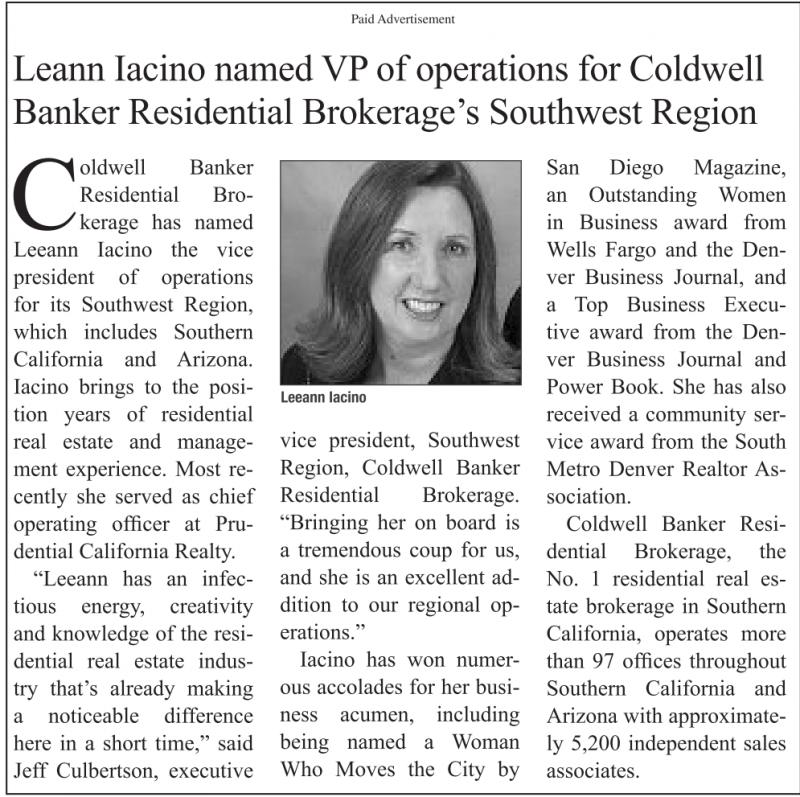 Banker Residential Brokerage has named Leeann Iacino the vice president of operations for its Southwest Region, which includes Southern California and Arizona. Iacino brings to the position years of residential real estate and management experience. Most recently she served as chief operating officer at Prudential California Realty.
