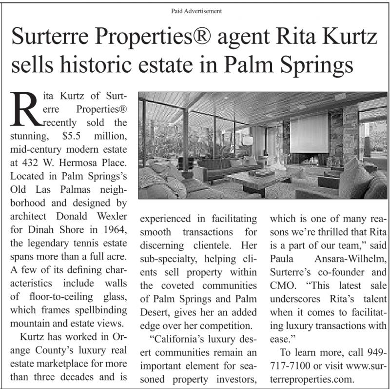 Paid Advertisement Surterre Properties® agent Rita Kurtz sells historic estate in Palm Springs Rita Kurtz of Surterre Properties® recently sold the stunning, $5.5 million, mid-century modern estate at 432 W. Hermosa Place. Located in Palm Springs’s Old Las Palmas neighborhood and designed by architect Donald Wexler for Dinah Shore in 1964, the legendary tennis estate spans more than a full acre. A few of its defining characteristics include walls of floor-to-ceiling glass, which frames spellbinding mountain and estate views. Kurtz has worked in Orange County’s luxury real estate marketplace for more than three decades and is experienced in facilitating smooth transactions for discerning clientele. Her sub-specialty, helping clients sell property within the coveted communities of Palm Springs and Palm Desert, gives her an added edge over her competition. “California’s luxury desert communities remain an important element for seasoned property investors, which is one of many reasons we’re thrilled that Rita is a part of our team,” said Paula Ansara-Wilhelm, Surterre’s co-founder and CMO. “This latest sale underscores Rita’s talent when it comes to facilitating luxury transactions with ease.” To learn more, call 949- 717-7100 or visit www.surterreproperties.com. See also