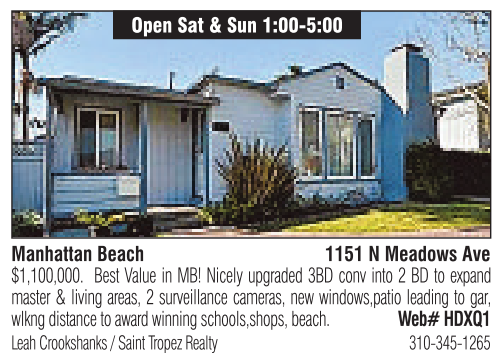 $1,100,000. Best Value in MB! Nicely upgraded 3BD conv into 2BDtoexpand master &living areas, 2surveillance cameras, new windows,patio leading to gar, wlkng distance to awardwinning schools,shops, beach. Web# HDXQ1