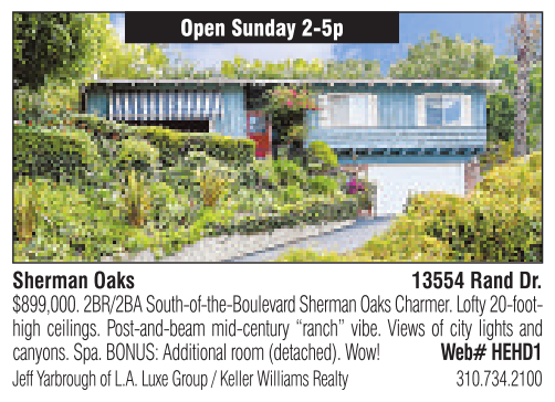$899,000. 2BR/2BA South-of-the-BoulevardSherman Oaks Charmer.Lofty 20-foothigh ceilings. Post-and-beam mid-century “ranch” vibe. Views of city lights and canyons. Spa. BONUS: Additional room (detached). Wow! Web# HEHD1