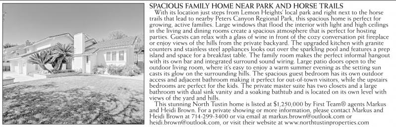 This stunning North Tustin home is listed at $1,250,000 by First Team® agents Markus and Heidi Brown. For a private showing or more information, please contact Markus and Heidi Brown at 714-299-3400 or via email at markus.brown@outlook.com or heidi.brown@outlook.com, or visit their website at www.northtustinproperties.com