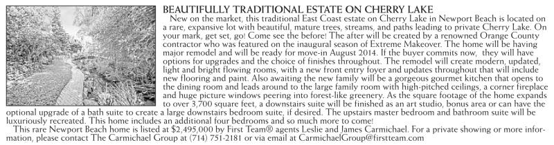 BEAUTIFULLY TRADITIONAL ESTATE ON CHERRY LAKE New on the market, this traditional East Coast estate on Cherry Lake in Newport Beach is located on a rare, expansive lot with beautiful, mature trees, streams, and paths leading to private Cherry Lake. On your mark, get set, go! Come see the before! The after will be created by a renowned Orange County contractor who was featured on the inaugural season of Extreme Makeover. The home will be having major remodel and will be ready for move-in August 2014. If the buyer commits now, they will have options for upgrades and the choice of finishes throughout. The remodel will create modern, updated, light and bright flowing rooms, with a new front entry foyer and updates throughout that will include new flooring and paint. Also awaiting the new family will be a gorgeous gourmet kitchen that opens to the dining room and leads around to the large family room with high-pitched ceilings, a corner fireplace and huge picture windows peering into forest-like greenery. As the square footage of the home expands to over 3,700 square feet, a downstairs suite will be finished as an art studio, bonus area or can have the optional upgrade of a bath suite to create a large downstairs bedroom suite, if desired. The upstairs master bedroom and bathroom suite will be luxuriously recreated. This home includes an additional four bedrooms and so much more to come! This rare Newport Beach home is listed at $2,495,000 by First Team® agents Leslie and James Carmichael. For a private showing or more information, please contact The Carmichael Group at (714) 751-2181 or via email at CarmichaelGroup@firstteam.com