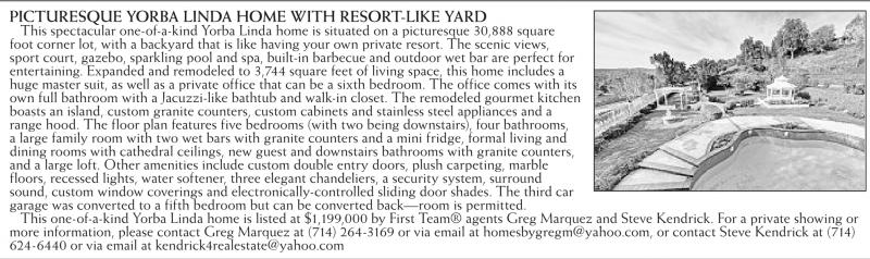 PICTURESQUE YORBA LINDA HOME WITH RESORT-LIKE YARD This spectacular one-of-a-kind Yorba Linda home is situated on a picturesque 30,888 square foot corner lot, with a backyard that is like having your own private resort. The scenic views, sport court, gazebo, sparkling pool and spa, built-in barbecue and outdoor wet bar are perfect for entertaining. Expanded and remodeled to 3,744 square feet of living space, this home includes a huge master suit, as well as a private office that can be a sixth bedroom. The office comes with its own full bathroom with a Jacuzzi-like bathtub and walk-in closet. The remodeled gourmet kitchen boasts an island, custom granite counters, custom cabinets and stainless steel appliances and a range hood. The floor plan features five bedrooms (with two being downstairs), four bathrooms, a large family room with two wet bars with granite counters and a mini fridge, formal living and dining rooms with cathedral ceilings, new guest and downstairs bathrooms with granite counters, and a large loft. Other amenities include custom double entry doors, plush carpeting, marble floors, recessed lights, water softener, three elegant chandeliers, a security system, surround sound, custom window coverings and electronically-controlled sliding door shades. The third car garage was converted to a fifth bedroom but can be converted back—room is permitted. This one-of-a-kind Yorba Linda home is listed at $1,199,000 by First Team® agents Greg Marquez and Steve Kendrick. For a private showing or more information, please contact Greg Marquez at (714) 264-3169 or via email at homesbygregm@yahoo.com, or contact Steve Kendrick at (714) 624-6440 or via email at kendrick4realestate@yahoo.com