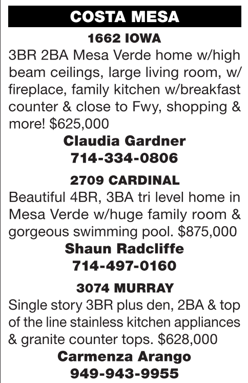COSTA MESA 1662 IOWA 3BR 2BA Mesa Verde home w/high beam ceilings, large living room, w/ fireplace, family kitchen w/breakfast counter & close to Fwy, shopping & more! $625,000 Claudia Gardner 714-334-0806 2709 CARDINAL Beautiful 4BR, 3BA tri level home in Mesa Verde w/huge family room & gorgeous swimming pool. $875,000 Shaun Radcliffe 714-497-0160 3074 MURRAY Single story 3BR plus den, 2BA & top of the line stainless kitchen appliances & granite counter tops. $628,000 Carmenza Arango 949-943-9955