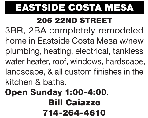 206 22ND STREET 3BR, 2BA completely remodeled home in Eastside Costa Mesa w/new plumbing, heating, electrical, tankless water heater, roof, windows, hardscape, landscape, & all custom finishes in the kitchen & baths. Open Sunday 1:00-4:00.