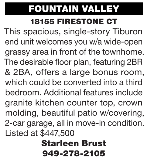 The desirable floor plan, featuring 2BR & 2BA, offers a large bonus room, which could be converted into a third bedroom. Additional features include granite kitchen counter top, crown molding, beautiful patio w/covering, 2-car garage, all in move-in condition. Listed at $447,500 Starleen Brust 949-278-2105