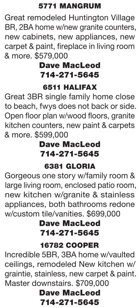6511 HALIFAX Great 3BR single family home close to beach, fwys does not back or side. Open floor plan w/wood floors, granite kitchen counters, new paint & carpets & more. $599,000 Dave MacLeod 714-271-5645