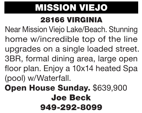 MISSION VIEJO 28166 VIRGINIA Near MissionViejo Lake/Beach.Stunning home w/incredible top of the line upgrades on a single loaded street. 3BR, formal dining area, large open floor plan. Enjoy a 10x14 heated Spa (pool) w/Waterfall. Open House Sunday. $639,900 Joe Beck 949-292-8099