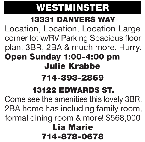 WESTMINSTER 13331 DANVERS WAY Location, Location, Location Large corner lot w/RV Parking Spacious floor plan, 3BR, 2BA & much more. Hurry. Open Sunday 1:00-4:00 pm Julie Krabbe 714-393-2869 13122 EDWARDS ST. Come see the amenities this lovely 3BR, 2BA home has including family room, formal dining room & more! $568,000 Lia Marie 714-878-0678