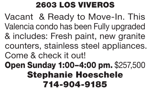 2603 LOS VIVEROS Vacant & Ready to Move-In. This Valencia condo has been Fully upgraded & includes: Fresh paint, new granite counters, stainless steel appliances. Come & check it out! Open Sunday 1:00–4:00 pm. $257,500 Stephanie Hoeschele 714-904-9185