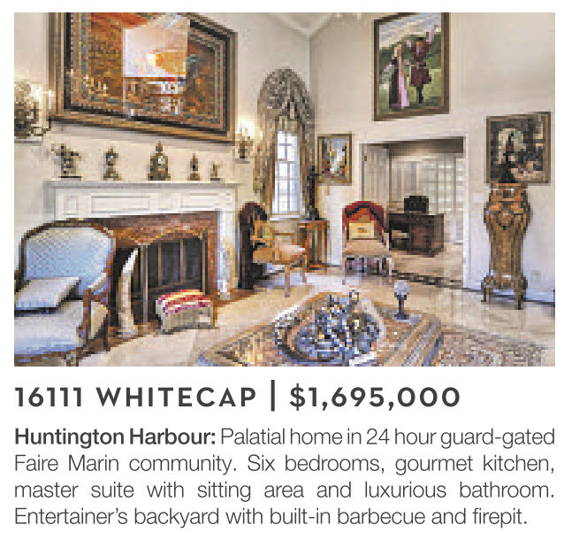 Huntington Harbour: Palatial home in 24 hour guard-gated Faire Marin community. Six bedrooms, gourmet kitchen, master suite with sitting area and luxurious bathroom. Entertainer’s backyard with built-in barbecue and firepit.