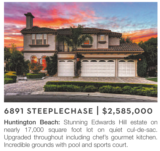 Huntington Beach: Stunning Edwards Hill estate on nearly 17,000 square foot lot on quiet cul-de-sac. Upgraded throughout including chef’s gourmet kitchen. Incredible grounds with pool and sports court.