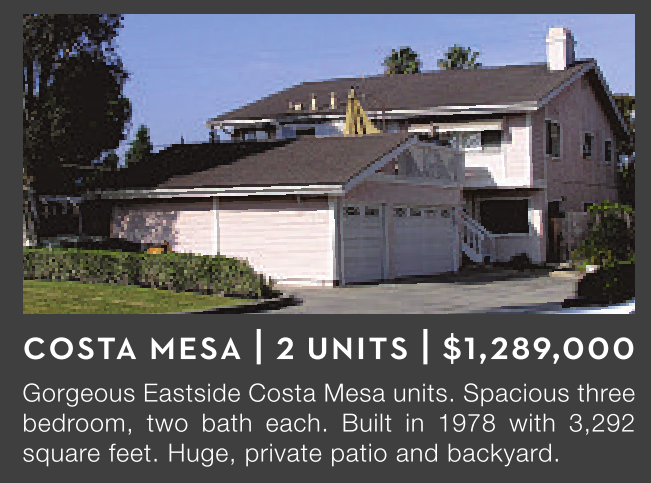 Gorgeous Eastside Costa Mesa units. Spacious three bedroom, two bath each. Built in 1978 with 3,292 square feet. Huge, private patio and backyard.