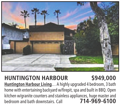 HUNTINGTON HARBOUR $949,000 HuntingtonHarbourLiving…Ahighlyupgraded 4bedroom, 3bath homewithentertainingbackyard w/firepit,spa andbuilt in BBQ. Open kitchen w/granite countersand stainlessappliances, huge masterand bedroomand bath downstairs. Call 714-969-6100
