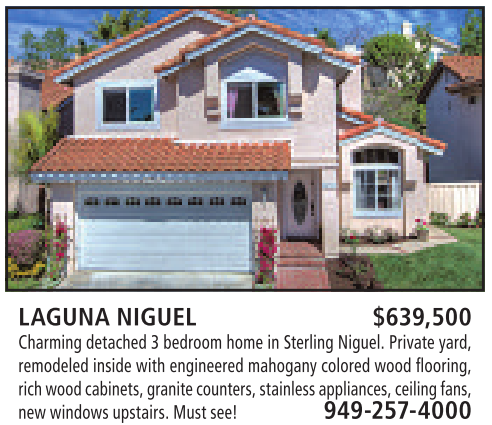 LAGUNA NIGUEL $639,500 Charming detached 3bedroom home in Sterling Niguel. Private yard, remodeled inside with engineered mahogany colored wood flooring, rich wood cabinets, granite counters, stainlessappliances, ceiling fans, new windowsupstairs. Must see! 949-257-4000