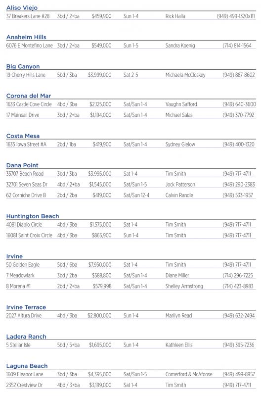 Laguna Beach 1609 Eleanor Lane 3bd /3ba $4,395,000 Sat/Sun 1-5 Comerford&McAfoose (949) 499-8957 2352 CrestviewDr 4bd /3+ba $3,199,000 Sat1-4 TimSmith (949) 717-4711