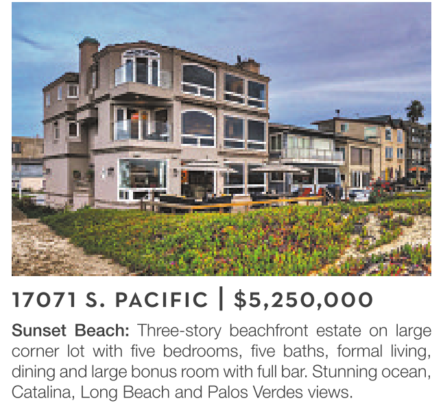 Sunset Beach: Three-story beachfront estate on large corner lot with five bedrooms, five baths, formal living, dining and large bonus room with full bar. Stunning ocean, Catalina, Long Beach and Palos Verdes views.