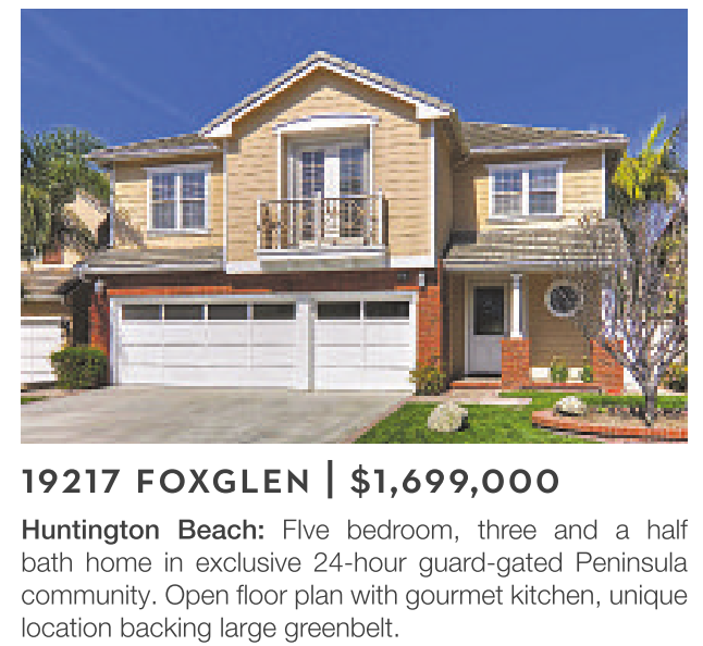 Huntington Beach: FIve bedroom, three and a half bath home in exclusive 24-hour guard-gated Peninsula community. Open floor plan with gourmet kitchen, unique location backing large greenbelt.