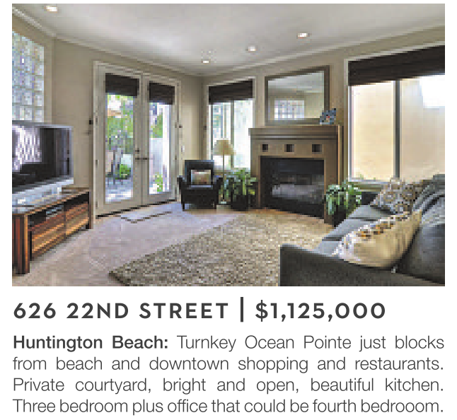 Huntington Beach: Turnkey Ocean Pointe just blocks from beach and downtown shopping and restaurants. Private courtyard, bright and open, beautiful kitchen. Three bedroom plus office that could be fourth bedrooom.
