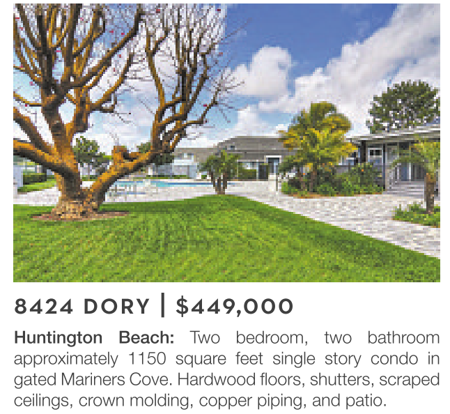 Huntington Beach: Two bedroom, two bathroom approximately 1150 square feet single story condo in gated Mariners Cove. Hardwood floors, shutters, scraped ceilings, crown molding, copper piping, and patio.