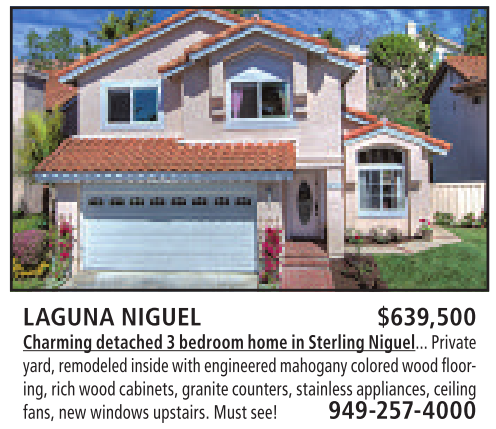 LAGUNA NIGUEL $639,500 Charming detached 3bedroom home in Sterling Niguel... Private yard,remodeledinsidewithengineeredmahoganycoloredwood flooring, rich wood cabinets, granite counters, stainlessappliances, ceiling fans,new windowsupstairs. Must see! 949-257-4000
