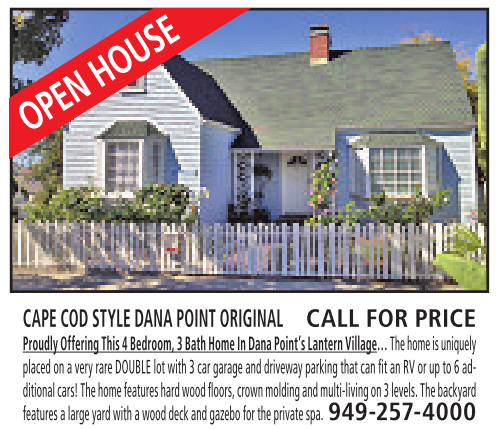 CAPE COD STYLE DANA POINT ORIGINAL CALL FOR PRICE ProudlyOffering This 4Bedroom,3BathHome In Dana Point’s LanternVillage… Thehome is uniquely placed onavery rare DOUBLE lot with 3car garage and driveway parking that can fitanRVorupto6additional cars!The home featureshardwood floors, crown molding andmulti-living on 3levels. Thebackyard featuresalarge yard with awood deck andgazebo for theprivatespa. 949-257-4000