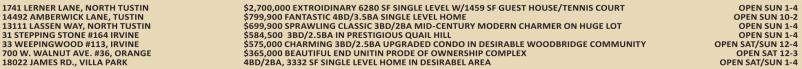 1741 LERNER LANE,NORTHTUSTIN $2,700,000 EXTROIDINARY6280SFSINGLE LEVELW/1459SFGUEST HOUSE/TENNISCOURT OPENSUN 1-4 14492AMBERWICK LANE,TUSTIN $799,900FANTASTIC4BD/3.5BA SINGLELEVEL HOME OPENSUN 10-2 13111 LASSEN WAY, NORTH TUSTIN $699,900SPRAWLING CLASSIC3BD/2BA MID-CENTURY MODERNCHARMERONHUGELOT OPEN SUN1-4 31 STEPPING STONE#164IRVINE $584,500 3BD/2.5BAINPRESTIGIOUS QUAIL HILL OPENSUN 1-4 33 WEEPINGWOOD #113,IRVINE $575,000 CHARMING 3BD/2.5BAUPGRADEDCONDO IN DESIRABLEWOODBRIDGECOMMUNITY OPEN SAT/SUN12-4 700W.WALNUTAVE.#36, ORANGE $365,000 BEAUTIFULEND UNITINPRODE OF OWNERSHIP COMPLEX OPENSAT 12-3 18022JAMESRD.,VILLA PARK 4BD/2BA,3332SFSINGLE LEVELHOME IN DESIRABELAREA OPENSAT/SUN 1-4