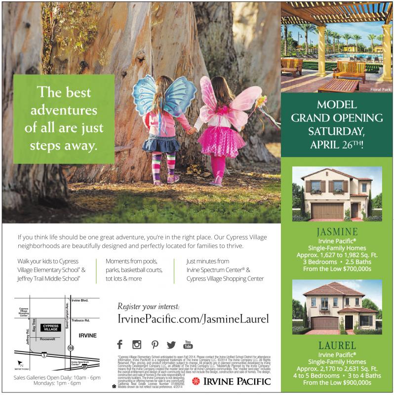*Cypress Village ElementarySchool anticipated to open Fall 2014. Please contact the Irvine Unified School District for attendance information. Irvine Pacific® is aregistered trademark of The Irvine Company LLC. ©2014 The Irvine Company LLC. All Rights Reserved. Plan, pricing, and product information subject to change. All projects are in planned communities developed by Irvine Community Development Company LLC, an affiliate of The Irvine Company LLC. “Masterfully Planned by the Irvine Company” means that the Irvine Company created the master land plan for all Irvine Company communities. The “master land plan” includes the overall entitlement and design of each community but does not include the design, construction and sale of homes.The design, construction and sale of homes is the sole responsibility of community builders.The Irvine Company is not designing, constructing or offering homes for sale in any community. California Real Estate License Number 01889266. Models shown do not reflect racial preference. 4/2014