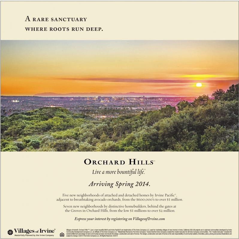 Villages of Irvine®, Orchard Hills™, Live amore bountiful life® and Irvine Pacific® are trademarks of The Irvine CompanyLLC, used for marketing villages of new homes in Irvine, California USA. All projects are in planned communities developed by Irvine Community Development CompanyLLC,an affiliate ofThe Irvine CompanyLLC.“Masterfully Planned byThe Irvine Company”means thatthe Irvine Companycreated the master land plan for all Irvine Companycommunities. The“master land plan”includes the overall entitlement and design of each community but does not include the design, construction and sale of homes.The design, construction and sale of homes is the sole responsibility of community builders.Amenities, plans, pricing and product illustrations are subject to change. ©2014 The Irvine CompanyLLC.All Rights Reserved. 4/2014
