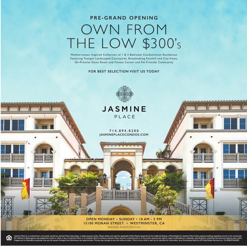 Jasmine Place is acondominium community owned by Jasmine Place Associates, asingle purpose entity.Please obtain and read the applicable Public Report approved by the California Bureau of Real Estate for Jasmine Place beforesigning anything regarding ahome in the community. No Federal or State agency has judged the merits or value, if any, ofJasmine Place. In aconstant effort to enhance Jasmine Place and the condominiums in it, the owner reserves the right to make modifications in materials, specifications, amenities and services without prior notice. Images are for illustrative purposes only and all square footages and dimensions are approximate. Pricing may change at any time without notice. This is not an offer to sell, but is intended for information only. Exclusively listed by KPI Real Estate Services Inc. CA BRE#01846229