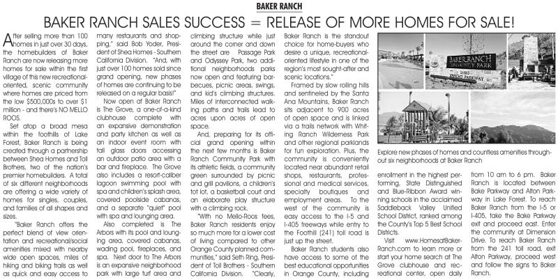 selling more than 100 homes in just over 30 days, the homebuilders of Baker Ranch are now releasing more